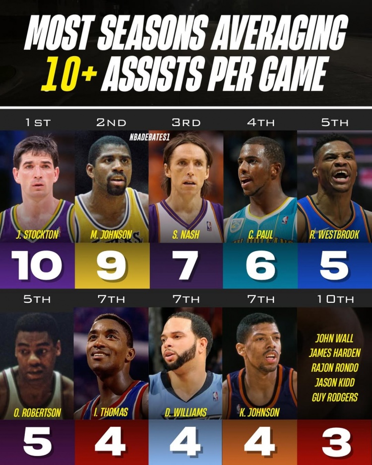 半岛体育-场均10+助攻赛季数榜:白煞10次第1 魔术师9次第2 纳什炮威登在列